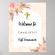 Golden, peach coloured marble print as background decorated with a golden cross, pampas grass and blush pink flowers and a white arch shaped frame. Personalise and add a name.