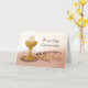 This is a beautiful keepsake card for either adult, teen or child, celebrating their First Holy Communion. A host with a cross is seen above a chalice. Wheat is flowing across the bottom of the card in shades of brown, tan and gold. Beautiful script print has First Holy Communion on the front of the card.