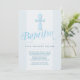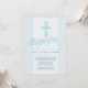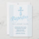 A blue and white baptism invitation with a decorative cross and the word "baptism" in calligraphy. (Pix). <br/><br/>The card is easy to customise with your wording, font, font colour and choice of six paper types.<br/><br/>Not exactly what you're looking for? All our products can be custom designed to meet your needs at no extra charge.<br/><br/>Simply contact us at askcottonlamb@gmail.com<br/><br/>Coordinating products available: