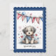 On the reverse, the blue border continues around a charming children’s book-style illustration of an adorable puppy wearing a red, white, and blue bandanna. Above the puppy hangs a festive string of Americana bunting and balloons. Below the illustration, the text reads “My First Fourth of July” in bold, festive lettering. Whimsical and heartwarming, this card makes a perfect keepsake or a thoughtful way to share the celebration with friends and family.