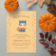 Adorable baby dressed in a black cat costume with a big orange bow is holding a lollipop with a skull image on it. A curved pumpkin stands just a little behind. First Halloween party invitation for baby of any gender.