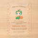 Adorable baby dressed in a green dragon costume with orange spikes and matching orange bib with a skull. A curved pumpkin stands just a little behind. First Halloween party invitation for baby of any gender.