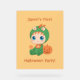 Adorable baby dressed in a green dragon costume with orange spikes and matching orange bib with a skull. A curved pumpkin stands just a little behind. Baby’s first Halloween party invitation, any gender.
