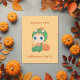 Adorable baby dressed in a green dragon costume with orange spikes and matching orange bib with a skull. A curved pumpkin stands just a little behind. Baby’s first Halloween party invitation, any gender.