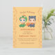 Adorable babies dressed in Halloween costumes. The one on the left is dressed as a green dragon with orange spikes. The one on the right is wearing a black cat costume with a big orange bow. A curved pumpkin sits between them and just a little behind. First Halloween party invitation for baby twins, any gender.