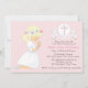 A sweet First Communion invitation with a blonde girl dressed in a pretty white Communion dress with flowers in her hair, kneeling in prayer and holding rosary beads. Above the text is a banner held by white doves and a pink and grey cross. The background is pink with a subtle floral pattern, which repeats on the back. (Some graphics AMBillustrations ©2017)
