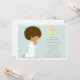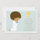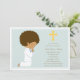Blue First Holy Communion invitation featuring a kneeling African American boy on the left, yellow cross with Communion or party details on the right in brown.