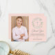 A decorative laurel garland, silver rings and cross sit above your special first holy communion thank you message and besides your own photo on a blush pink background. The reverse features a matching laurel garland, silver rings and cross. Designed by Thisisnotme©