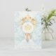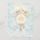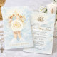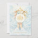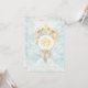 This First Holy Communion invitation features a reverent watercolor depiction of the Sacred Host, adorned with the IHS monogram and elevated in gentle adoration. Four angels kneel prayerfully amid soft clouds, their expressions reflecting awe and devotion before the Most Blessed Sacrament. Subtle hues of blue and ivory are enriched with warm antique gold accents, creating a peaceful and heavenly composition appropriate for a child’s First Holy Communion.