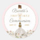 Stunning First Holy Communion sticker featuring rustic floral & greenery elements with girl in traditional white dress, against a soft blush pink background. Click on personalise to add your own text.