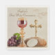 Celebrate a beautiful First Holy Communion day with elegant personalized luncheon napkins featuring a reverent Eucharistic design of a chalice, host, bread, grapes, and cross. Set on a soft ecru background, the warm tones and classic imagery create a timeless look that is perfect for after Mass gatherings, family receptions, and parish celebrations. Customize with your child’s name to create a meaningful and coordinated detail for your event. Also available in a variety of napkin styles, and your choice of ecru or white, to match your Communion décor perfectly.