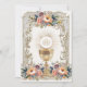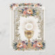 Celebrating the Sacrament of First Holy Communion is a wondrous occasion. This traditional Catholic custom-designed vintage First Holy Communion Invitation features a beautiful image of the Chalice and Host, the Eucharist overlaid on an ornate gold frame, accented with a floral design. All text and fonts can be easily modified.