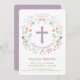 This modern and trendy First Holy Communion invitation card features an illustrated wreath of flowers encircling a cross with the words "first communion" in an elegant script font. The back side is purple (can be customised to any colour of your choice) with a white quatrefoil pattern over it. A perfect and personal way to invite guests to a child's special sacrament celebration.