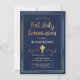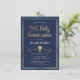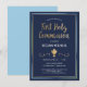 This modern and classy First Holy Communion invitation features an illustrated gold chalice a blue, green and gold border, and the words "First Holy Communion" in gold (simulated foil details). The background is a navy blue colour, but can be customised to any colour you choose. The text is customisable for your special religious sacrament.