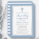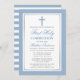 Elegant Light Blue and Silver First Holy Communion Invitation with Cross. Striped Back.