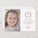 Simple and elegant First Holy Communion thank you card begins with your daughter's photo. An editable thank you message is to the right. This thank you card coordinates with the Barely Blush Rose collection. A pretty pink rose and greenery wreath surrounds a feminine mauve pink cross. You will also find coordinating welcome sign and party decoration templates to make your party planning easy and convenient.