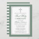 Modern Elegant First Holy Communion Invitation with Cross. Sage Green and White Stripes. Silver Cross.