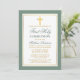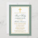 Modern Elegant First Holy Communion Invitation with Cross. Sage Green and White Stripes. Gold Cross.
