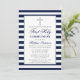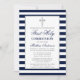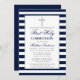 Elegant First Holy Communion Invitation with Cross. Blue and White Stripes. Silver Cross.