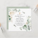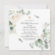 Modern botanical design features ivory white roses nestled in sage green eucalyptus leaves. Your First Communion celebration details are placed in the center on a white circle.
