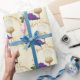 First Holy Communion wrapping paper design features the image of the Eucharist suspended above the chalice, along with the grapes. The words, "First Holy Communion" are displayed as an arch in gold lettering. Design is displayed as a pattern. Designed to accompany the First Holy Communion collection.