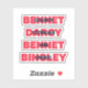 Show your bookish side and love for Jane Austen books with this bookish sticker featuring the names of the major characters from Pride and Prejudice by Jane Austen: Elizabeth Bennet, Fitzwilliam Darcy, Jane Bennet, Charles Bingley in pink and dark blue.