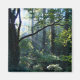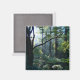 Brilliant white rays of the morning sun streaming from behind dark branches into a rich green summer forest, with massive ivy-covered trees and fertile underbrush.