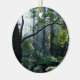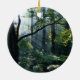 Brilliant white rays of the morning sun streaming from behind dark branches into a rich green summer forest, with massive ivy-covered trees and fertile underbrush.