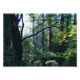 Brilliant white rays of the morning sun streaming from behind dark branches into a rich green summer forest, with massive ivy-covered trees and fertile underbrush.