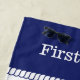 Personalise this nautical first mate's beach towel with your name. Design features a drawing of a navy blue anchor and navy blue and white rope border. The word "First Mate" is above and below is a name for you to personalise.