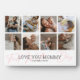 Happy first mothers day plaque featuring the cute saying "first mother's day" in a elegant pink script font, 8 photos for you to replace with your own, the text "love you mummy", and the childs name.