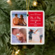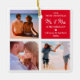 Photo collage newlywed 2021 christmas ornament featuring a chic white background that can be changed to any colour, 3 photos of you and your partner, the words "our first christmas mr & mrs", a cute heart, your names, and the year. On the reverse is another 3 pictures for you to personalise.