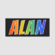This fun, vibrant, multicolored name tag design features the common first name "ALAN", with the letters of the name having a colourful rainbow spectrum like gradient colouring pattern, on a black coloured background. A nametag like this might be worn by a volunteer, an employee, or a customer service representative named Alan, to help identify the wearer to others. [~Z0000344]