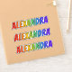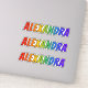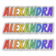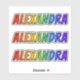 This multicolored, fun, and vibrant sticker design features the common first name or given name "ALEXANDRA", with the letters of the name having a colourful rainbow spectrum like gradient colouring pattern. It might be a fun present to give to somebody whose given name is Alexandra. [~Z0000361]