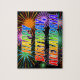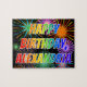 This exciting and lively birthday-themed jigsaw puzzle design has the message "HAPPY BIRTHDAY, ALEXANDRIA" having a colorful rainbow spectrum inspired gradient pattern, and a fun bursting celebratory fireworks inspired background pattern. A colorful puzzle like this might be a fun way to send birthday wishes to somebody named Alexandria. [~Z0000465]