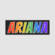 This fun, vibrant, multicolored name tag design features the common first name "ARIANA", with the letters of the name having a colourful rainbow spectrum like gradient colouring pattern, on a black coloured background. A nametag like this might be worn by a staff member, a customer service representative, or a volunteer named Ariana, to help identify the wearer to customers or other people. [~Z0000344]