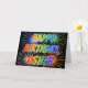 This fun, vibrant, multicolored birthday greeting card design features the message "HAPPY BIRTHDAY," and the common first name "ASHER" with the letters having a colourful rainbow spectrum like gradient colouring pattern. The background of the front also features a colourful pattern inspired by the appearance of bursting celebratory fireworks. The inside features a custom greeting message, or could perhaps be cleared and left blank if a message is to be written by hand instead. A birthday greeting card like this could be fun to give to somebody named Asher on their birthday. [~Z0000350]