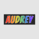 This fun, vibrant, multicolored name tag design features the common first name "AUDREY", with the letters of the name having a colourful rainbow spectrum like gradient colouring pattern, on a black coloured background. A nametag like this might be worn by a customer service representative, an employee, or a staff member whose given name is Audrey, to help identify the wearer to customers or other people. [~Z0000344]