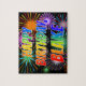 This lively, exciting, birthday-themed jigsaw puzzle design has the message "HAPPY BIRTHDAY, BLAKE" having a colourful rainbow spectrum inspired gradient pattern, and a fun bursting celebratory fireworks inspired background pattern. An exciting puzzle like this might be used to send a birthday greeting message to somebody named Blake. [~Z0000465]
