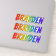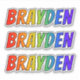 This multicolored, fun, and exciting sticker design features the common first name or given name "BRAYDEN", with the letters of the name featuring a colourful rainbow spectrum like gradient colouring pattern. It might be a fun present to give to somebody whose given name is Brayden. [~Z0000361]