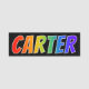 This fun, vibrant, multicolored name tag design features the common first name "CARTER", with the letters of the name having a colourful rainbow spectrum like gradient colouring pattern, on a black coloured background. A nametag like this might be worn by a customer service representative, a volunteer, or an employee whose given name is Carter, to help identify the wearer to others. [~Z0000344]