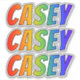 This fun, vibrant, and exciting sticker design features the common first name or given name "CASEY", with the letters of the name having a colourful rainbow spectrum inspired gradient colouring pattern. It might be a fun present to give to somebody who is named Casey. [~Z0000361]