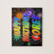 This exciting, vibrant, birthday-themed jigsaw puzzle design has the message "HAPPY BIRTHDAY, COREY" having a colourful rainbow spectrum inspired gradient pattern, and a fun bursting celebratory fireworks inspired background pattern. An exciting puzzle like this might be used to send a birthday greeting message to somebody named Corey. [~Z0000465]