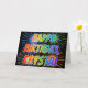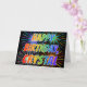 This vibrant, multicolored and fun birthday greeting card design features the message "HAPPY BIRTHDAY," and the common first name "CRYSTAL" with the letters having a colourful rainbow spectrum like gradient colouring pattern. The background of the front also features a colourful pattern inspired by the appearance of bursting fireworks. The inside features a personalised greeting message, or could perhaps be cleared and left blank if a message is to be written by hand instead. This might be a fun way to acknowledge the birthday of somebody named Crystal. [~Z0000350]