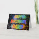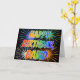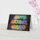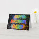 This vibrant, multicolored and fun birthday greeting card design features the message "HAPPY BIRTHDAY," and the common first name "DAVID" with the letters having a colourful rainbow spectrum like gradient colouring pattern. The background of the front also features a colourful pattern inspired by the look of bursting celebratory fireworks. The inside features a customisable greeting message, or could perhaps be cleared and left blank if a message is to be written by hand instead. A greeting card like this might be a fun way to send a personalised birthday message to somebody named David. [~Z0000350]