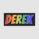 This fun, vibrant, multicolored name tag design features the common first name "DEREK", with the letters of the name having a colourful rainbow spectrum like gradient colouring pattern, on a black coloured background. A nametag like this might be worn by an employee, a staff member, or a customer service representative whose first name is Derek, to help identify the wearer to customers or other people. [~Z0000344]