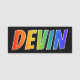 This fun, vibrant, multicolored name tag design features the common first name "DEVIN", with the letters of the name having a colourful rainbow spectrum like gradient colouring pattern, on a black coloured background. A nametag like this might be worn by a staff member, a volunteer, or a customer service representative named Devin, to help identify the wearer to others. [~Z0000344]