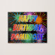 This lively and fun birthday-themed jigsaw puzzle design features the message "HAPPY BIRTHDAY, DOMINIQUE" having a colourful rainbow spectrum inspired gradient pattern, and an exciting bursting celebratory fireworks inspired background pattern. An exciting puzzle like this might be a fun way to send birthday wishes to somebody named Dominique. [~Z0000465]