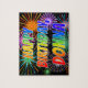 This exciting, lively, birthday-themed jigsaw puzzle design features the message "HAPPY BIRTHDAY, DONNA" having a colourful rainbow spectrum inspired gradient pattern, and a fun bursting celebratory fireworks inspired background pattern. An exciting puzzle like this might be a fun way to acknowledge the birthday of somebody named Donna. [~Z0000465]