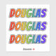This exciting, vibrant, and fun sticker design features the common first name or given name "DOUGLAS", with the letters of the name featuring a colourful rainbow spectrum inspired gradient colouring pattern. It might be a fun present to give to somebody who is named Douglas. [~Z0000361]